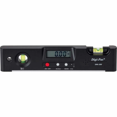 Digi-Pas® is a leading digital level manufacturer with a full range of digital levels with varying precision for engineering and trade professionals as well as DYI users. Digi-Pas® levels allow you to measure angles digitally, electronically, and with an actual number, at every angle, all 360 degrees of a complete circle. So setting up a machine level, installing a deck, stair rail, extending a roof or determining how much an old floor has sagged is simpler, less time consuming, and more accurate. Digi-Pas® levels are simple to use. Just press the on/off button and you will see the angle of any surface with decimal-point accuracy. The DWL200 is a torpedo digital level measuring 8 inches long and 2 inches wide. It displays any angles in % of slope or degrees. This model has accuracy of 0.1 degrees at 0° and 90° and 0.2 degrees at all other angles. A buzzer feature makes audible beep sound at 0°. The hold function will freeze the angle display on the LCD. The unit also has a large magnetic base allowing for strong attachment to magnetic surfaces. The DWL 200 has longer than average battery life and an automatic 3 mins off feature. The strong impact resistance ABS polymer material casing is molded with a tough aluminum base with built in vials.