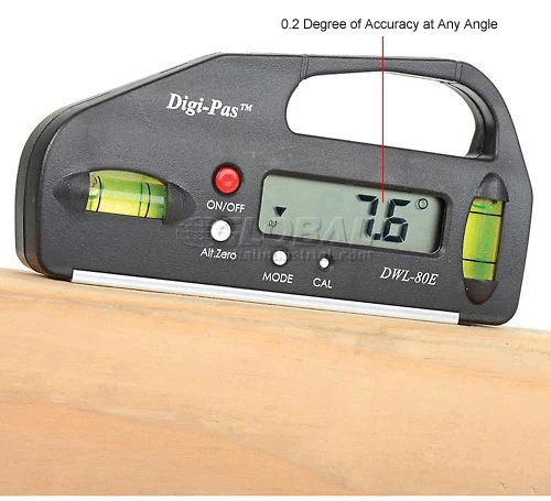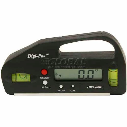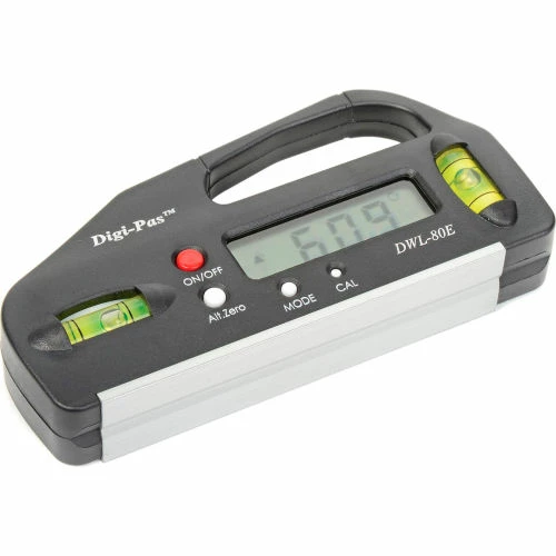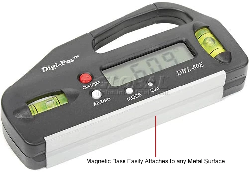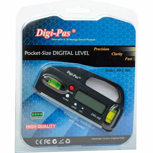 Digi-Pas® is a leading digital level manufacturer with a full range of digital levels with varying precision for engineering and trade professionals as well as DYI users. Digi-Pas® levels allow you to measure angles digitally, electronically, and with an actual number, at every angle, all 360 degrees of a complete circle. So setting up a machine level, installing a deck, stair rail, extending a roof or determining how much an old floor has sagged is simpler, less time consuming, and more accurate. Digi-Pas® levels are simple to use. Just press the on/off button and you will see the angle of any surface with decimal-point accuracy. The DWL80 series is great for finding angles where small and confined spaces limits the size of the level that one can use. The DWL80G is a mini pocket digital level that allows for easy, clear and precise digital display of any angles in degrees or % of slope. This model has accuracy of 0.1 degrees at 0° and 90° and 0.2 degrees at all other angles. With a magnetic base, the DWL80G can easily attach to metal surfaces. The hold function freezes the reading on the LCD. This unit has longer than average battery life and an automatic 3 mins off feature. The strong impact resistance ABS polymer material casing is molded with a tough aluminum base with built in vials.