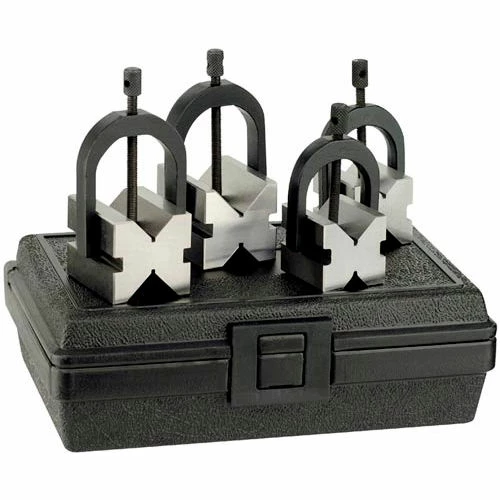 Surfaces are square and parallel within .0005″. V-grooves are square and parallel with all surfaces within .0005″. Includes a shop-hardened case for storage. V-block set includes two 1-1/2″L x 1-1/4″W x 1-1/4″H blocks and two 2″L x 1-1/2″W x 1-1/2″H blocks.