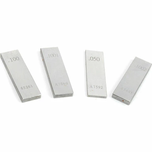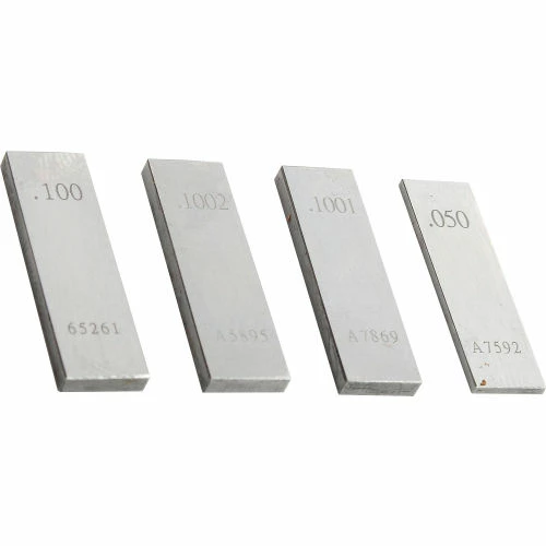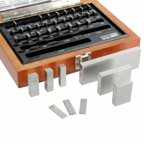 - 36 pcs. 9 blocks .1001″ thru .1009″ step of .0001″, 9 blocks .101″ thru .109″ step of .001″, 9 blocks .110″ thru .190″ step of .01, 5 blocks .100″ thru .500″ step of .1″, 3 blocks 1″, 2″, 4″, 1 block .050″.