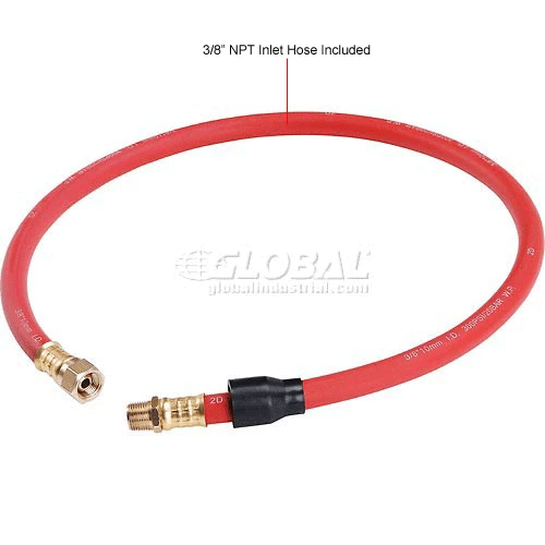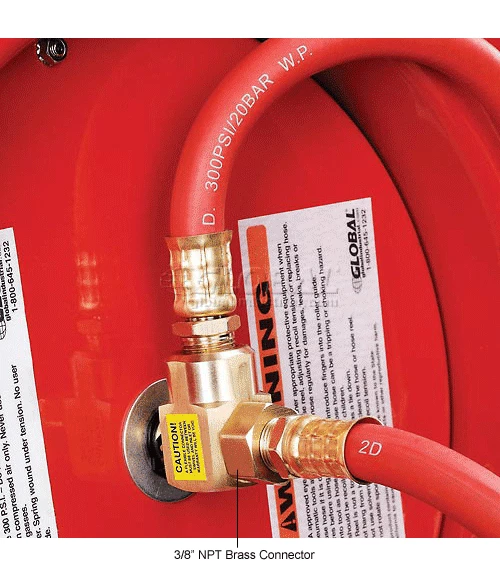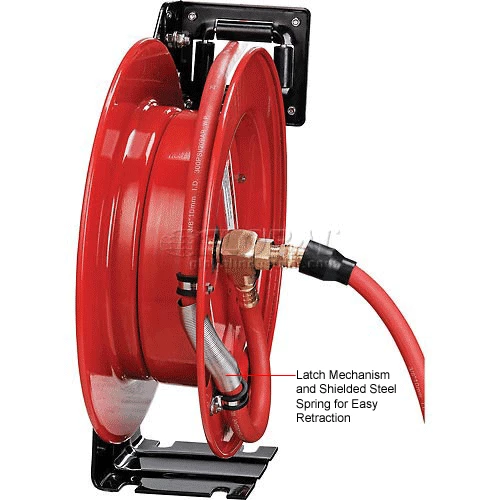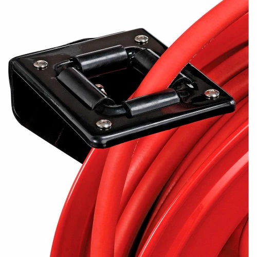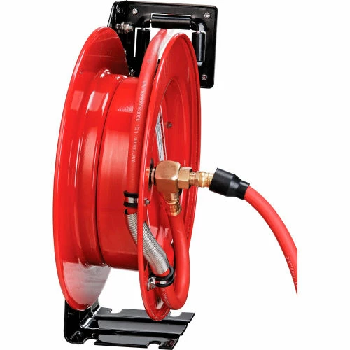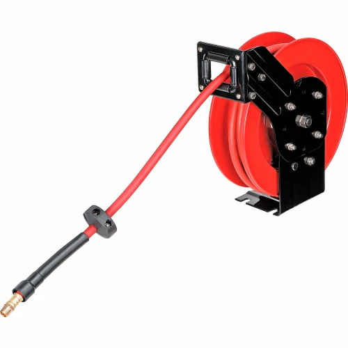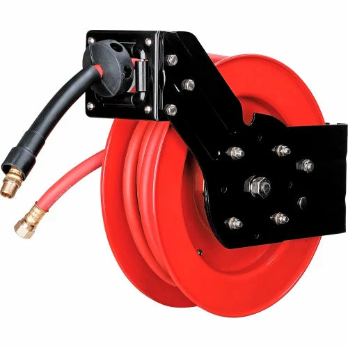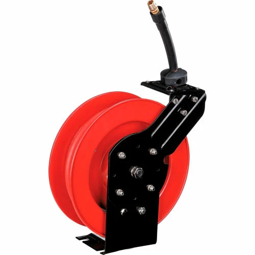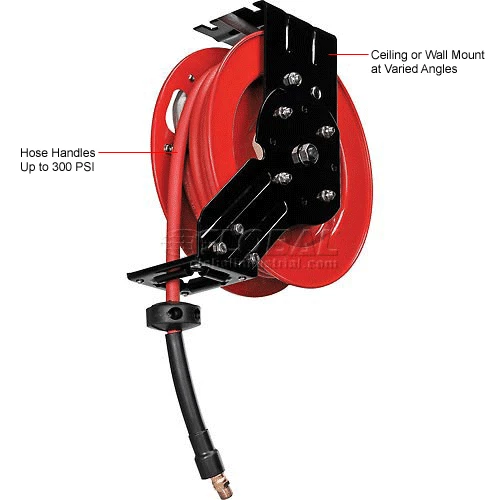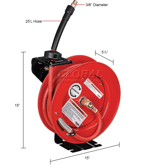 Built for industrial use, the Global Industrial Spring Retractable Steel Hose Reel is ideal for use in various industrial applications that consistently use air tools. Its latch mechanism and shielded steel spring ensure a long life and easy retraction every time. Hose handles air up to 300 PSI while an adjustable guide arm allows floor or wall mounting at different angles for ease of use. The hose measures 25’L while the reel itself only weighs 22 lbs. Includes the roller guide, 3/8″ NPT Inlet hose, hose stopper, 3/8″ NPT male brass connector for air tools and protective sleeve for the hose end. 1-Year Limited Warranty.
