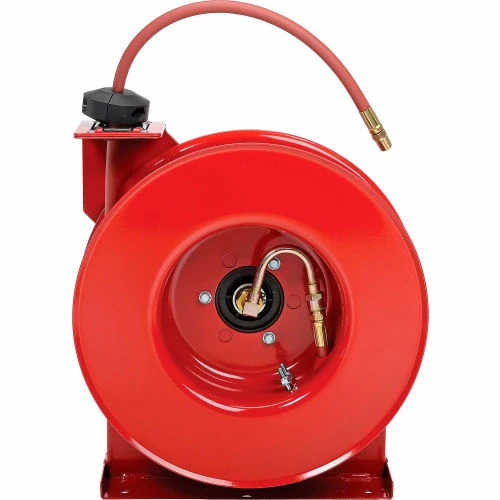 This spring driven reel is built for heavy duty use with heavy gauge reinforced steel reel and base, a field-tested swivel and corrosion resistant powder coat finish. Latch mechanism and shielded stainless steel spring ensure long life and easy retraction every time. Hose handles air or water, carries 250 psi and withstands 150°F. Adjustable guide arm allows floor or wall mounting at 7 different angles. Hose measures 50’L with an inside diameter of 1/4″. 2 Year Limited Warranty.